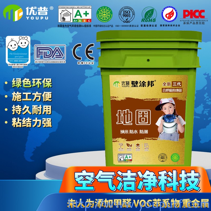 “優(yōu)普壁涂邦納米防水防潮地固”是一種專門作用于水泥基面上的防水涂料。其采用進(jìn)口高分子聚合物,經(jīng)過多道工序復(fù)合而成,高分子聚合物能滲透水泥地面,牢牢封鎖水泥地面的松散顆粒,便于裝飾材料與地面緊密結(jié)合,保證了水泥地面的封閉處理,有效防止地磚的空鼓現(xiàn)象。優(yōu)普壁涂邦地固耐水防潮,也可以避免木地板受潮氣侵蝕而產(chǎn)生的變形,同時避免日后從地板縫隙中“撲灰”。此產(chǎn)品不含甲醛等有害物質(zhì),是綠色環(huán)保產(chǎn)品,對人體無害。