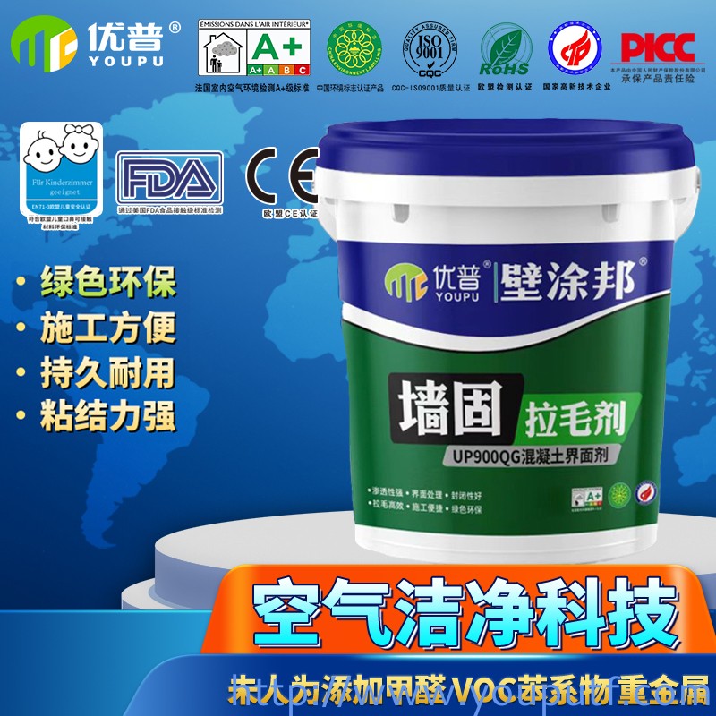 優普壁涂邦墻固拉毛劑是一種由聚合物乳液、水溶性膠體、多功能助劑組成的全新環保新型墻面加固產品本產品具有封閉效果好、滲透性強、拉毛強度超高等特點。該產品與水泥混合可對光滑墻面進行人工造毛提高膩子或灰漿與基層的粘結力。